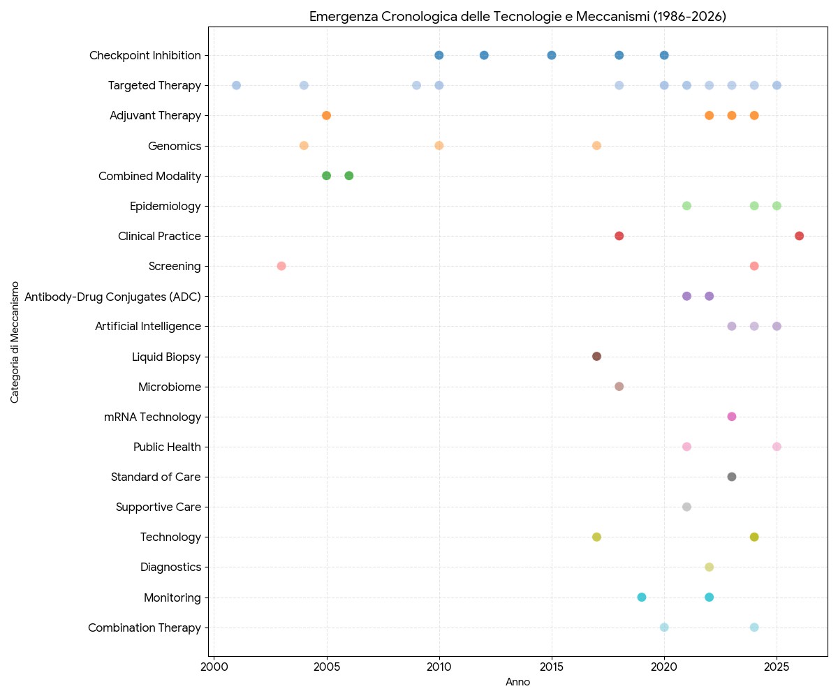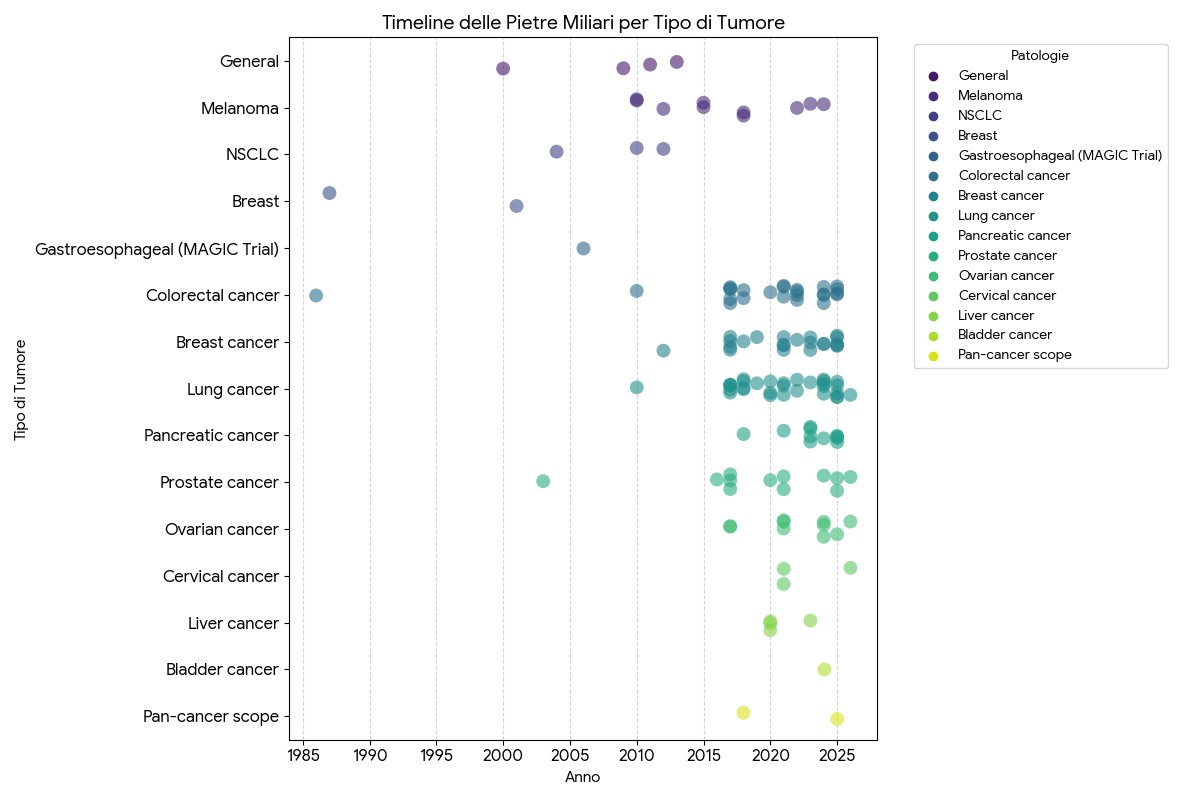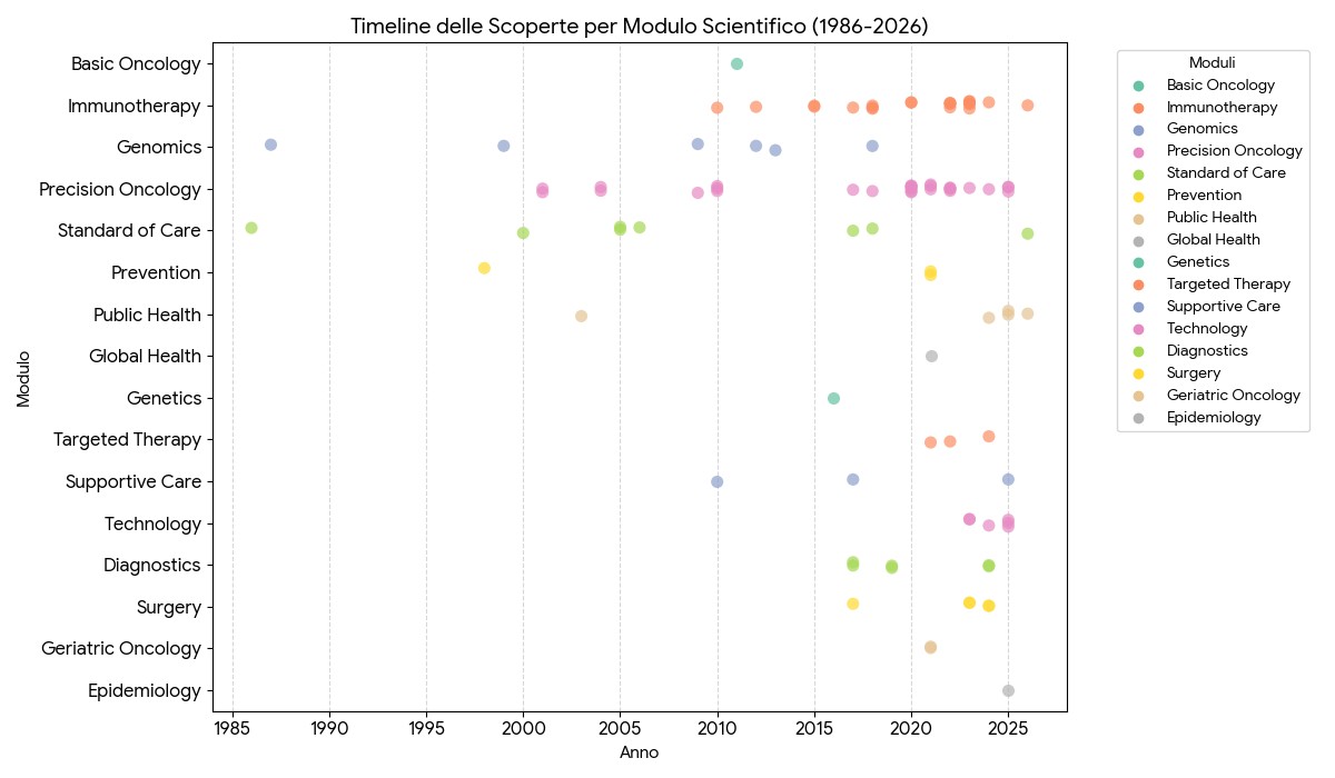 Sintesi di 40 anni di progresso: Abbiamo analizzato migliaia di pubblicazioni per isolare le 100 pietre miliari che hanno definito l’oncologia moderna. Il CTKA ti permette di vedere l’intero percorso, dalla scoperta di un gene alla disponibilità di una cura.